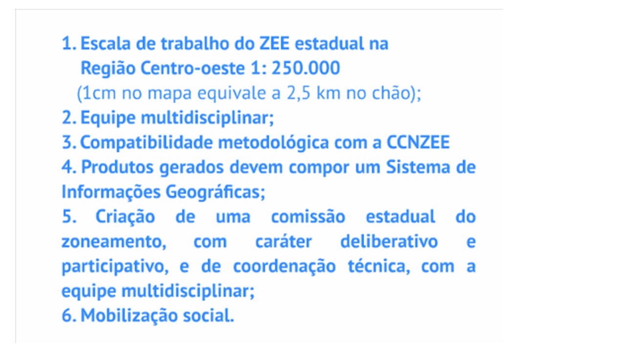 O Código Florestal brasileiro (Lei 12.651 de 2012) determina que os estados devem elaborar o Zoneamento Ecológico Econômico (ZEE) no prazo de cinco anos após sua promulgação, conforme salientou Ramminger durante o encontro. Outra condicionante legal do ZEE é tratada na Lei Federal n° 11.952/2009, que dispõe sobre a regularização fundiária na Amazônia Legal, e proíbe os estados que não possuem zoneamento aprovado por Lei Estadual de firmar novos convênios com a União.