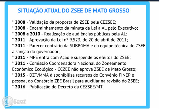 Em 2008 o Governo do Estado apresentou uma minuta de Lei à Assembleia Legislativa (ALMT), que tratava do planejamento e ordenamento territorial do estado, tendo o zoneamento como o principal instrumento. Após três anos de discussões e audiências públicas, a Casa de Leis aprovou um substitutivo total ao zoneamento apresentado pelo Executivo Estadual, a Lei nº 9.523/2011. O Ministério Público Estadual (MPE), entendendo que a Assembleia não poderia promover tais alterações, deu entrada em uma ação civil pública e a Justiça determinou a suspensão dos efeitos da Lei no que concerne ao zoneamento.